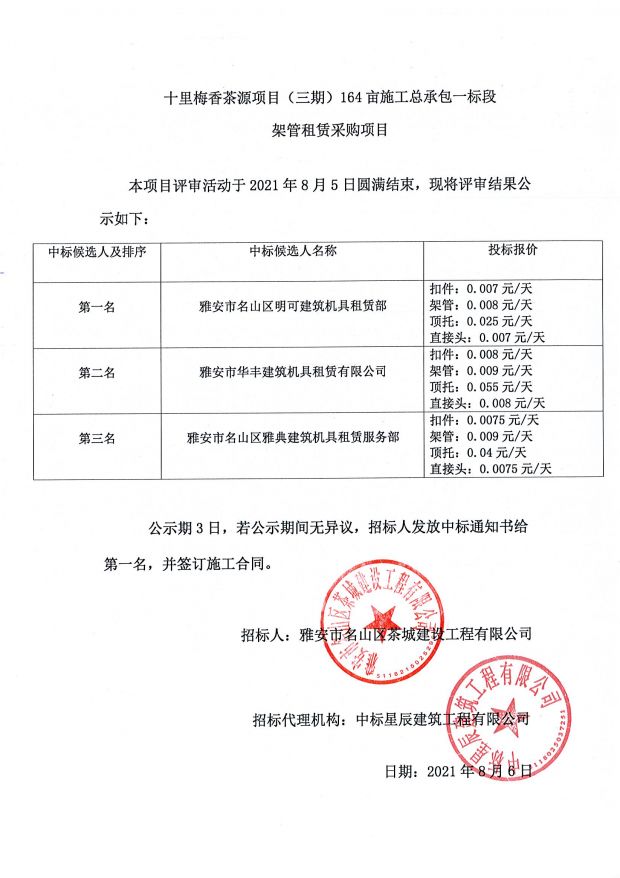 十里梅香茶源項目(三期)164畝施工總承包一標段架管租賃采購中標公示