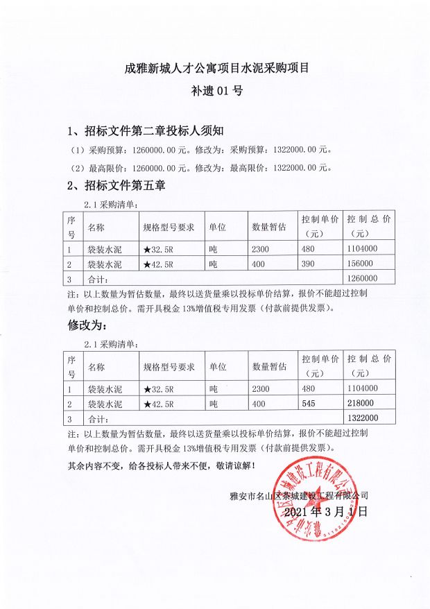 成雅新城人才公寓項目水泥采購項目補(bǔ)遺01號